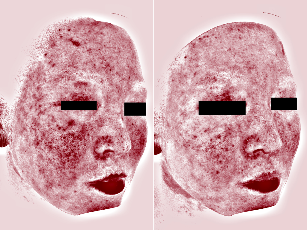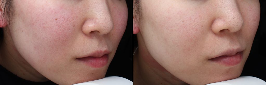 鈴木院長の所見及び治療方針:顔の赤みに対してフォトフェイシャル(IPL)だけでなく、YAGレーザーフェイシャルを併用して治療。ロングパルスのYAGレーザーをIPL前に照射することで、IPLの熱伝導効率を上げ、赤みや毛穴に重点を置き、治療にあたりました。
