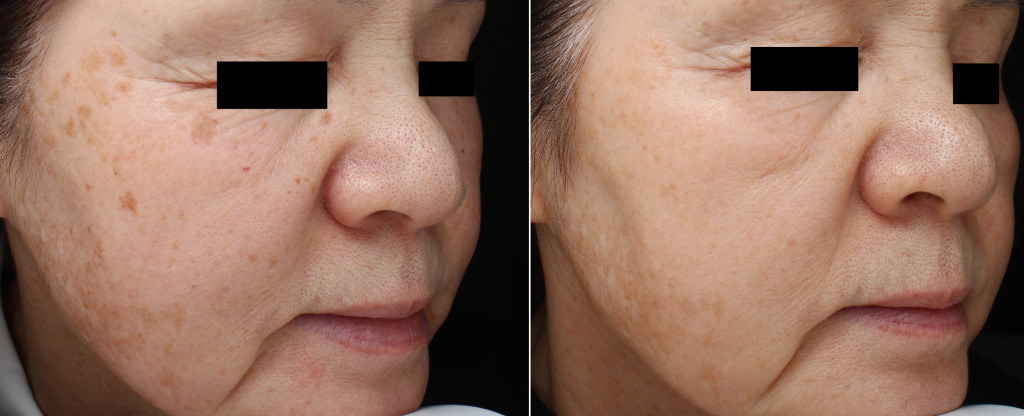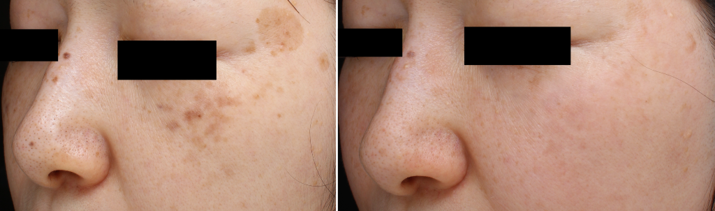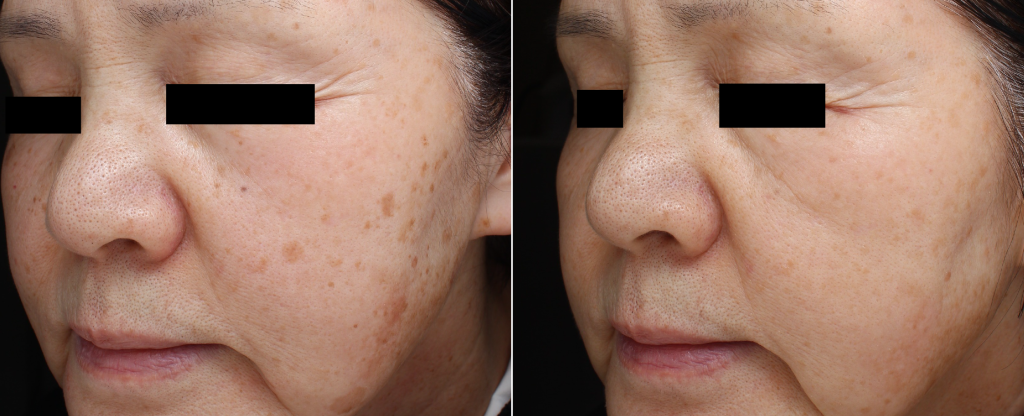 悠花院長の所見及び治療方針:左右頬に肝斑が見られたので、トラネキサム酸内服、スキンケア、肝斑を悪化させない波長フィルターとパルス幅等の設定を用いたフォトフェイシャルで、真皮の再生及び肝斑上の小型の日光性色素斑を改善させ、肝斑のコントロールがついてきた所で、少し大きめの日光性色素斑をQ-Rubyレーザーで施術しました。メンテナンス治療として、年に何回かIPLをすることで、治療したお肌の維持がしやすくなります。